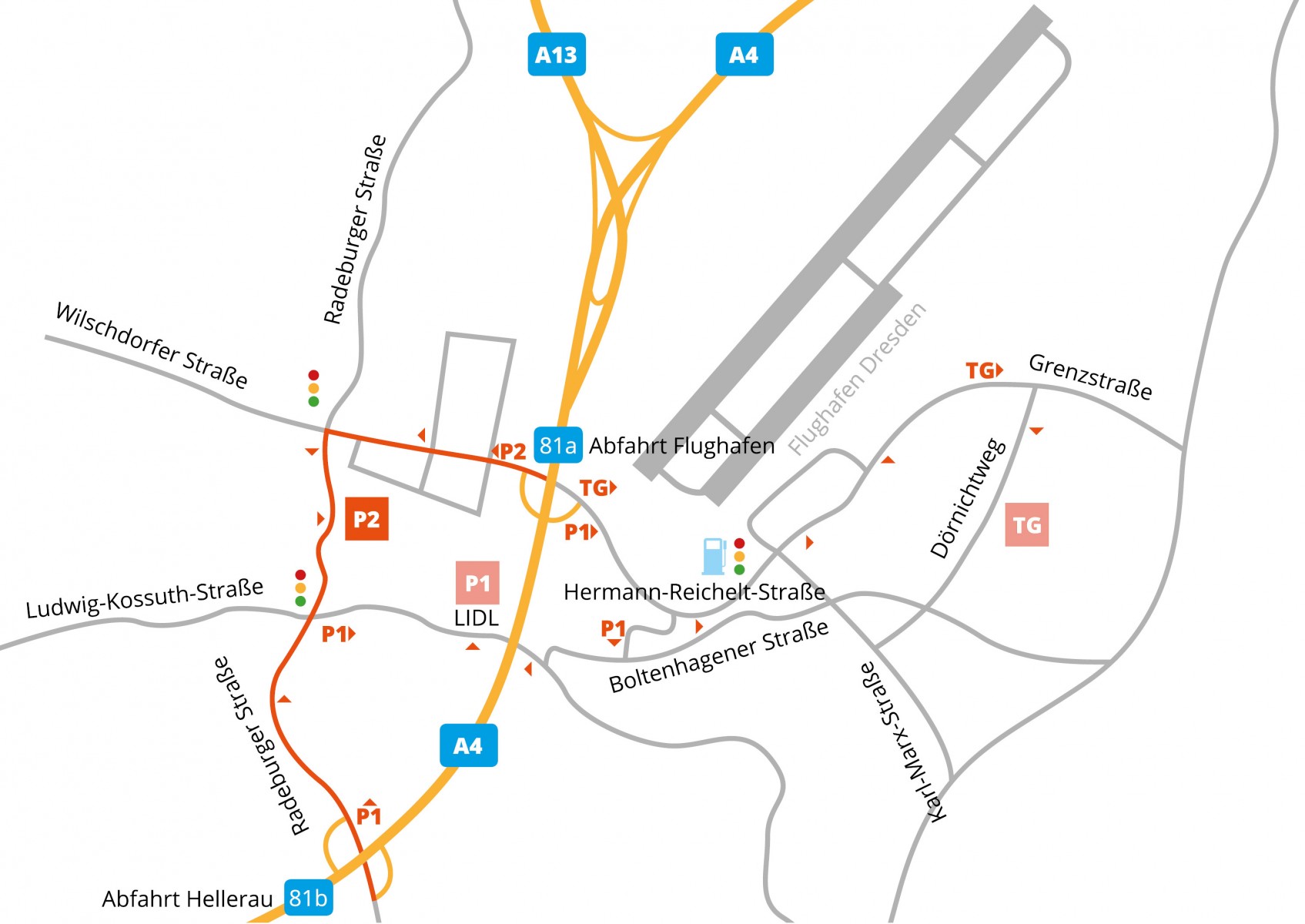Leicht zu finden: Unser Flughafen Dresden Parkplatz P2 befindet sich in unmittlebarer Nähe zu der Autobahnabfahrt Dresden Flughafen und ist so ganz bequem, ohne Stau, Verkehrschaos oder Umweltzonen zu erreichen. Kunden aus der Richtung Erfurt / Chemnitz / Erzgebirge oder Tschechien können bereits die Autobahnabfahrt Hellerau ausfahren und sparen so etwas Zeit. Jeder Kunde erhält mit der Buchungsbestätigung eine ausführliche Anfahrtsbeschreibung. P2 Parkplatz Anschrift: Radeburger Straße 214, 01109 Dresden